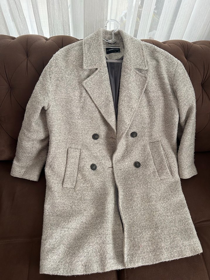 Yumuşak dokulu, klasik yakalı çift düğmeli gri kaban. İki ön cepli ve sıcak tutan astarlıdır.