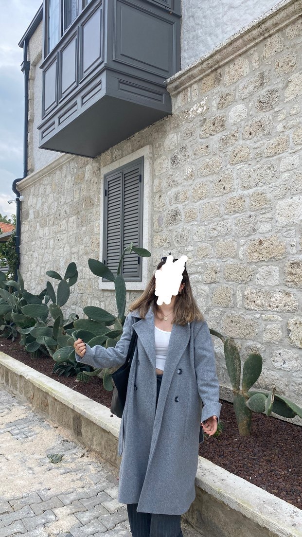 Çift düğmeli, uzun kesim ve yumuşak, sıcak kumaştan yapılmış gri kaban. Klasik yakalı ve rahat bir görünüm sağlar.