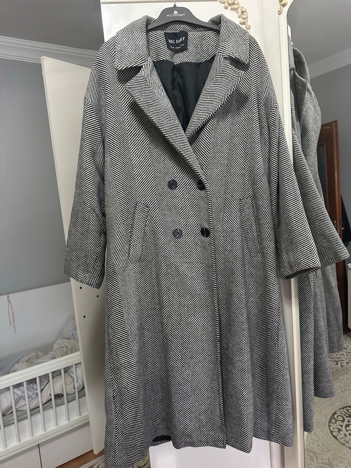 Çift düğmeli, klasik yakalı gri kaban, yan cepler ve yumuşak astarla rahatlık sağlar.