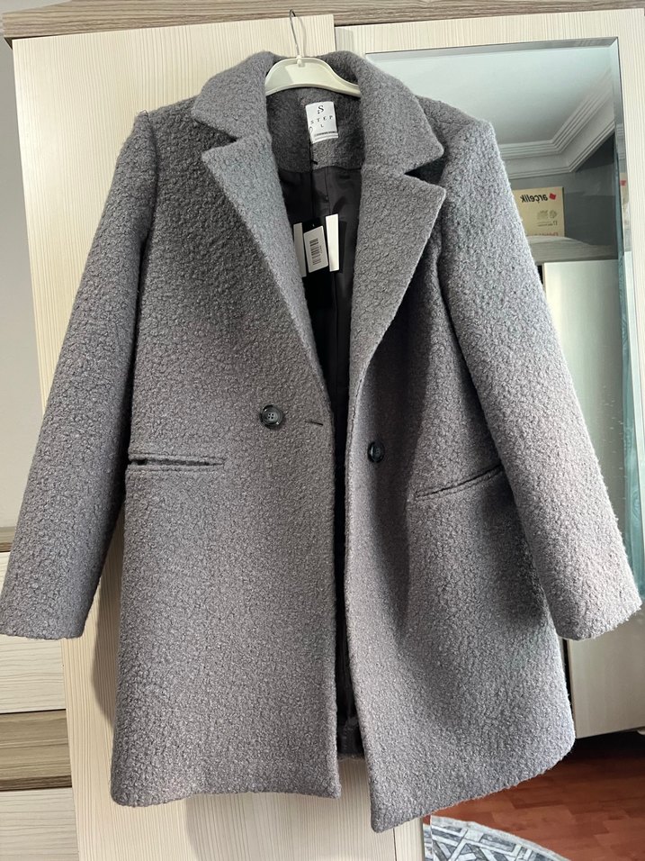 Çift düğmeli, iki yan cepli, yumuşak dokulu gri kaban. Klasik yaka ve rahat kesime sahiptir. Yeni ve etiketli