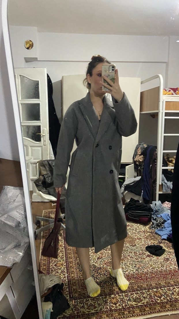 Çift düğmeli tasarıma sahip gri uzun kaban, yumuşak ve sıcak kumaştan üretilmiştir. Klasik ve rahat bir stil sunar.
