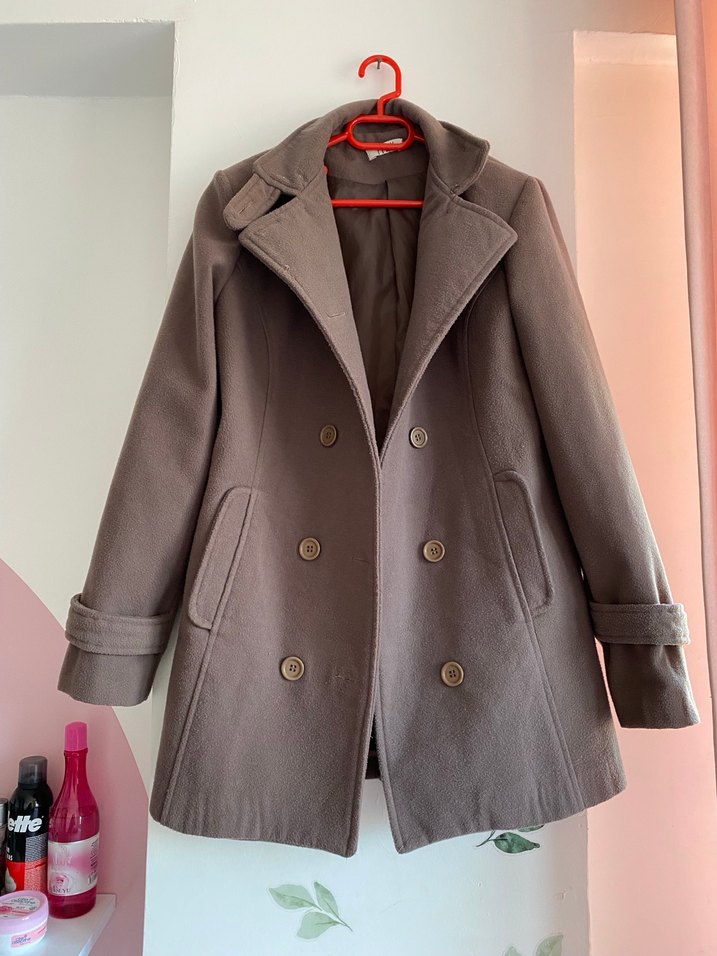 Çift düğmeli kahverengi kaban, yan ceplerle klasik ve sıcak bir dış giyim seçeneği sunar.