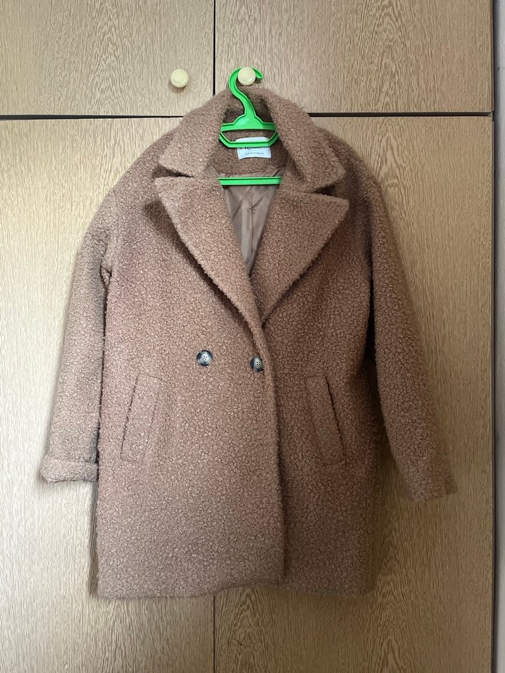 Çift düğmeli ve yan cepli kahverengi peluş kaban, yumuşak ve sıcak tutan dokusuyla öne çıkar.
