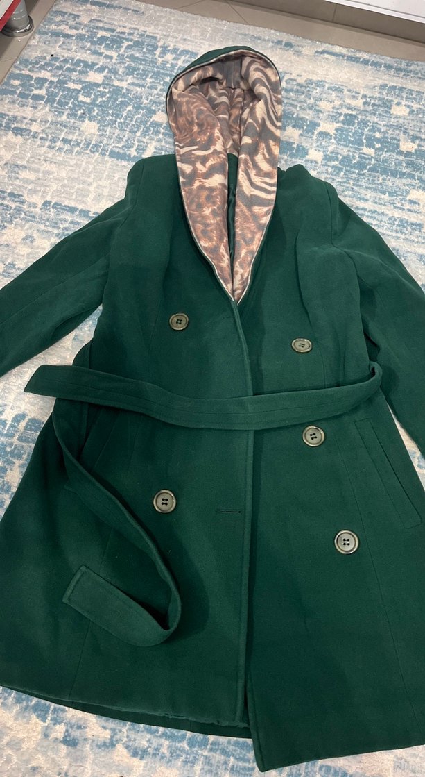 Çift düğmeli ve kemerli yeşil kaban, desenli astarıyla şık ve rahat bir kullanım sunar.