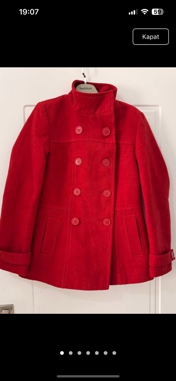 Çift düğmeli ön yüzü ve yüksek yakasıyla kırmızı kaban, klasik ve sıcak bir tasarım sunar. Uzun kollu ve yan ceplidir.