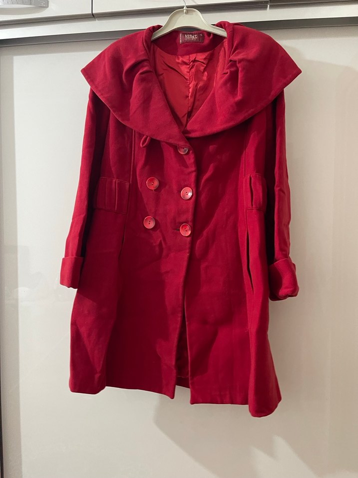 Çift düğmeli ve geniş yakalı kırmızı kaban, uzun kollu ve yan ceplidir. Sıcak tutan şık bir görünüme sahiptir.