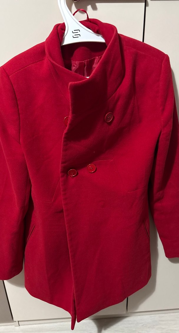 Çift düğmeli, kadife dokulu kırmızı kaban. Yumuşak ve sıcak tutan kumaşı ile yüksek yaka ve uzun kolludur.