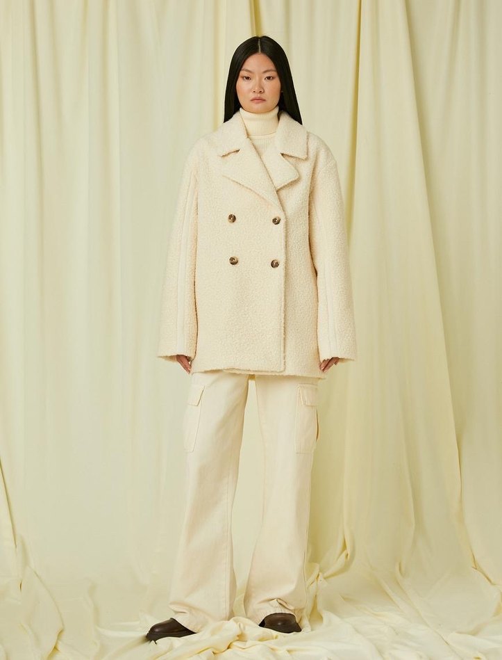 Çift düğmeli krem rengi kaban, yumuşak dokulu kumaş ve geniş yaka ile tasarlanmıştır. Uzun kollu ve konforludur.