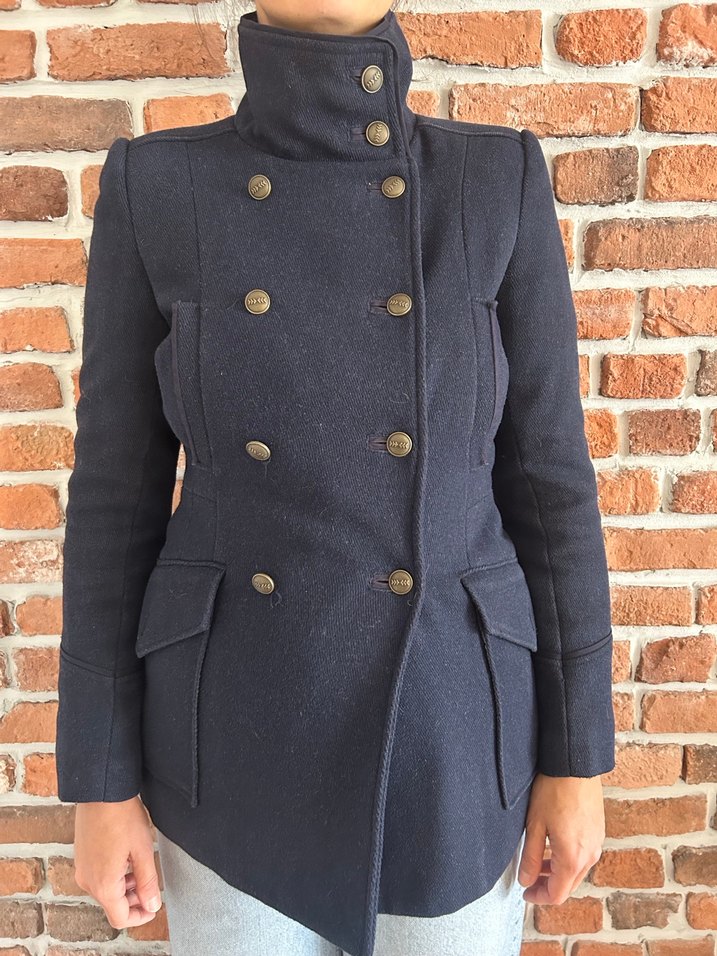 Çift düğmeli metal butonlu, yüksek yakalı lacivert kaban, ön cep kapakları ile şık ve yapısal bir tasarıma sahiptir.