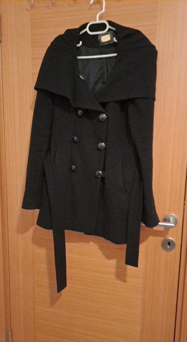 Çift düğmeli, geniş yakalı siyah kaban, ayarlanabilir bel kemeri ile.Kapüşonlu. 2 cebi var.%51 polyester,%33 viskon,%11 yün,%5 elastan.