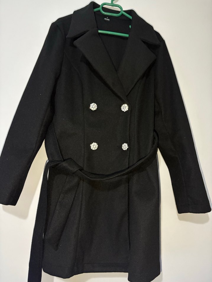 Çift düğmeli tasarıma sahip siyah kaban, belden bağlamalıdır ve uzun kolludur. Klasik yaka ile tamamlanmıştır.