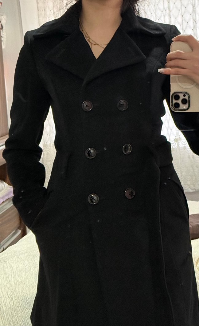 Yapılı yakalı, çift düğmeli siyah kaban, yan ceplidir ve uzun kolludur.