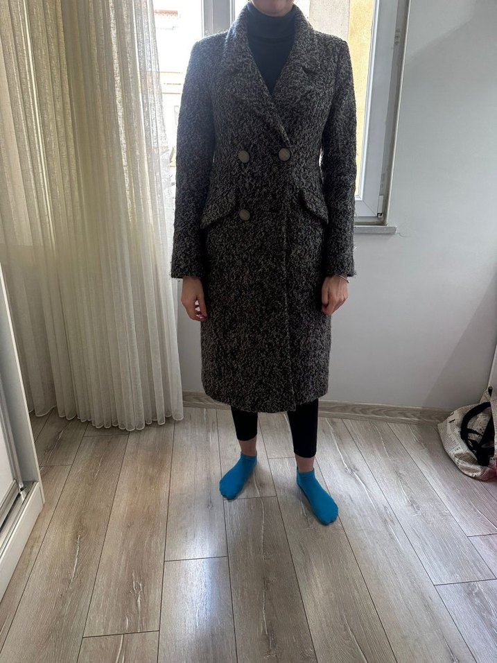 Çift düğmeli ve cepli, dokulu sıcak kumaştan uzun gri kaban.