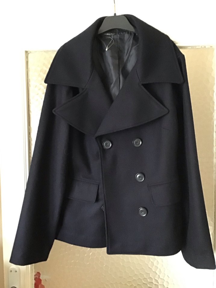Geniş yaka ve ön ceplere sahip çift düğmeli siyah kaban, iç kısmı düzgün astarlı. Afrodit marka 3 beden