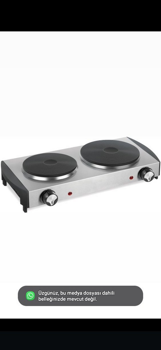 İki adet ısıtma plakalı, bağımsız sıcaklık kontrol düğmeleri bulunan gri elektrikli ocak. Paslanmaz çelik yüzey ve çalışma göstergeleri mevcuttur.