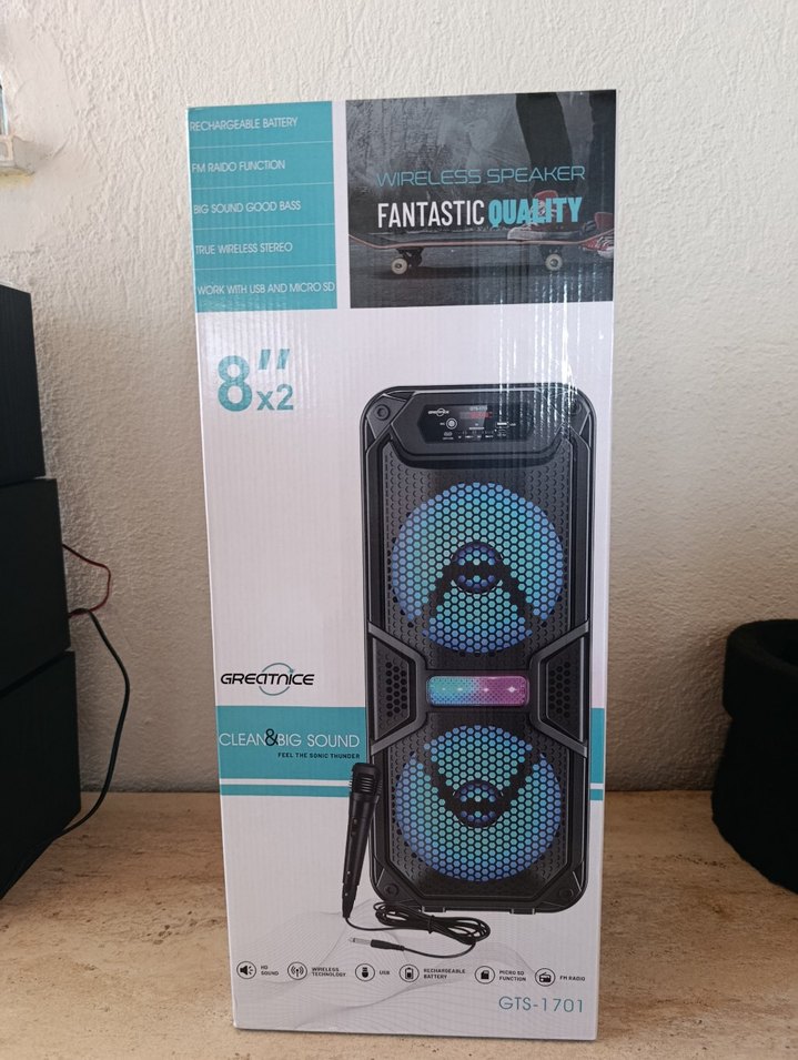 Çift 8 inç hoparlörlü kablosuz Bluetooth hoparlör, temiz ve güçlü ses sunar. FM radyo, USB ve micro SD desteği ile çok yönlü müzik çalar. Şarj edilebilir bataryası taşınabilirlik sağlar.