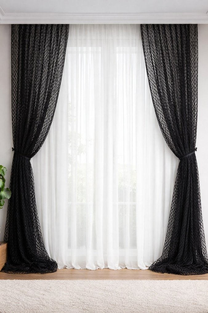 çift kanat siyah file fon perde.. her kanat en 130 boy 240 santimdir.. pilesiz düz dikim kornişli kullanıma hazırdır.. adet fiyatı 350 tl .. 2 adet fiyatı 700 tl.dir..