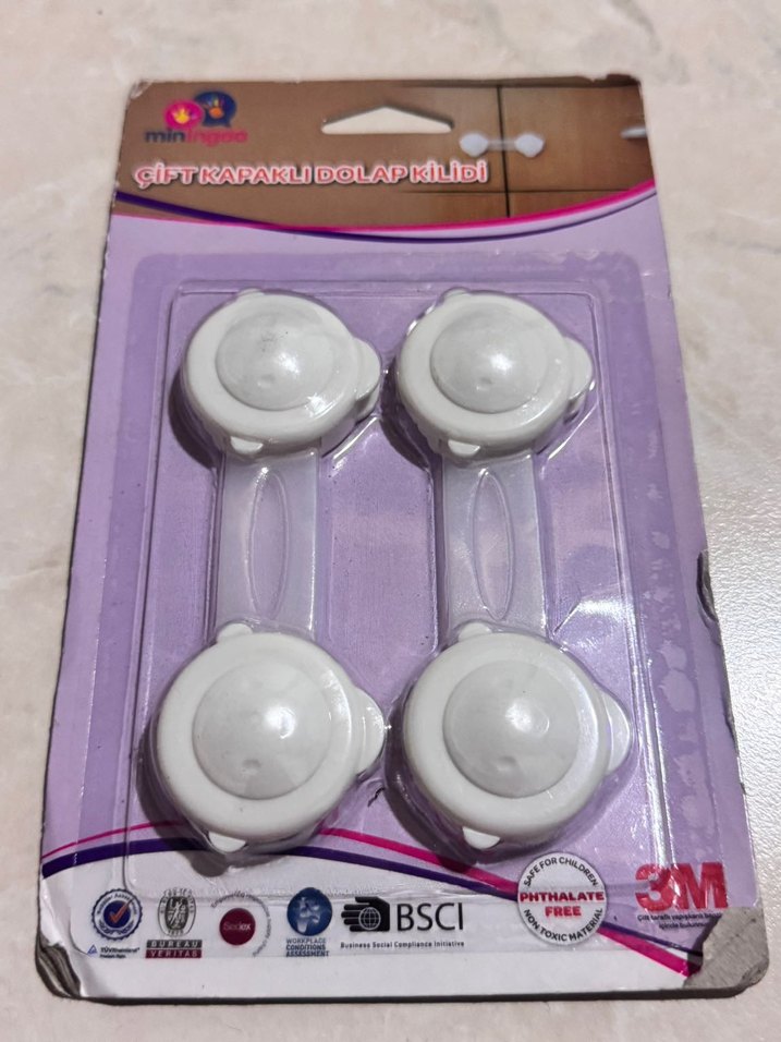 Çift kapaklı dolap kilidi, beyaz renkte, kolay kullanımlı kilitleme mekanizmasına sahip. Ftalat içermez, kalite sertifikalıdır.