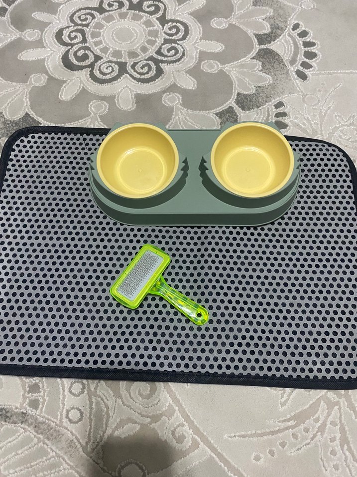 Kahverengi çift kaplı kedi mama kabı, gri dokulu paspas ve canlı yeşil tüy toplama fırçası ile pet bakım seti.