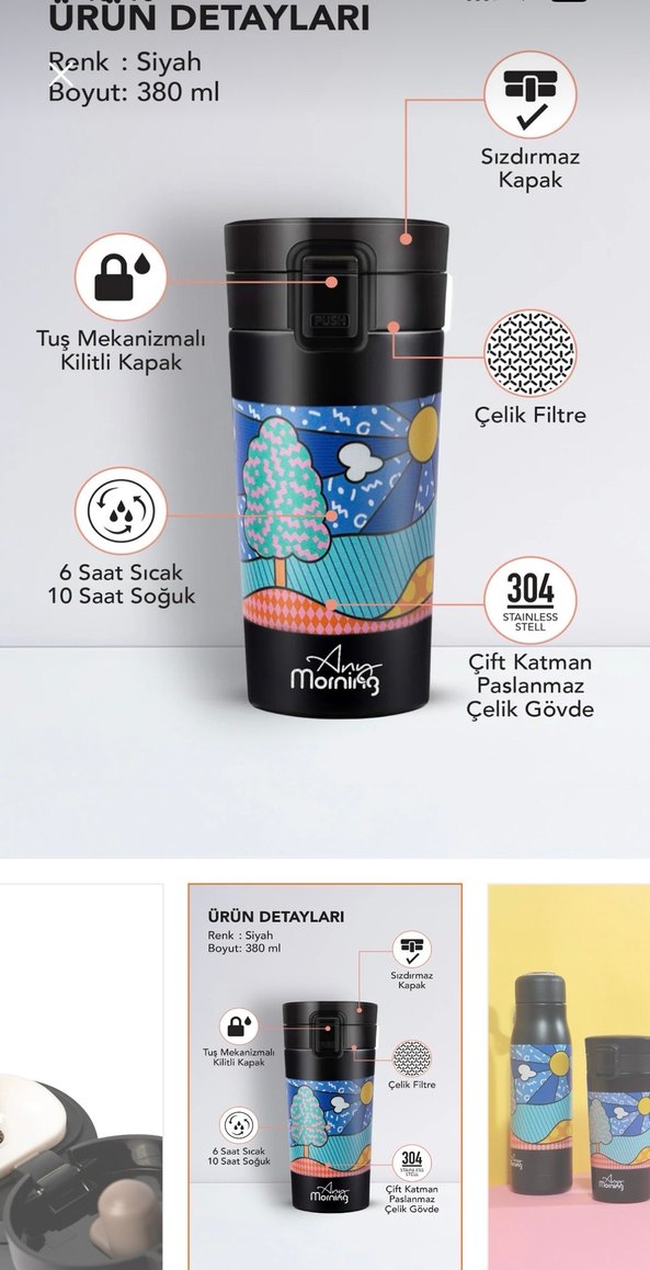 İster yolda ister evde heryerde seninle! Renkli termos, tuş mekanizmalı kilitli kapak ve çelik filtreye sahip çift katman paslanmaz çelik gövdelidir. 6 saat sıcak, 10 saat soğuk tutar. Hacim 380 ml.