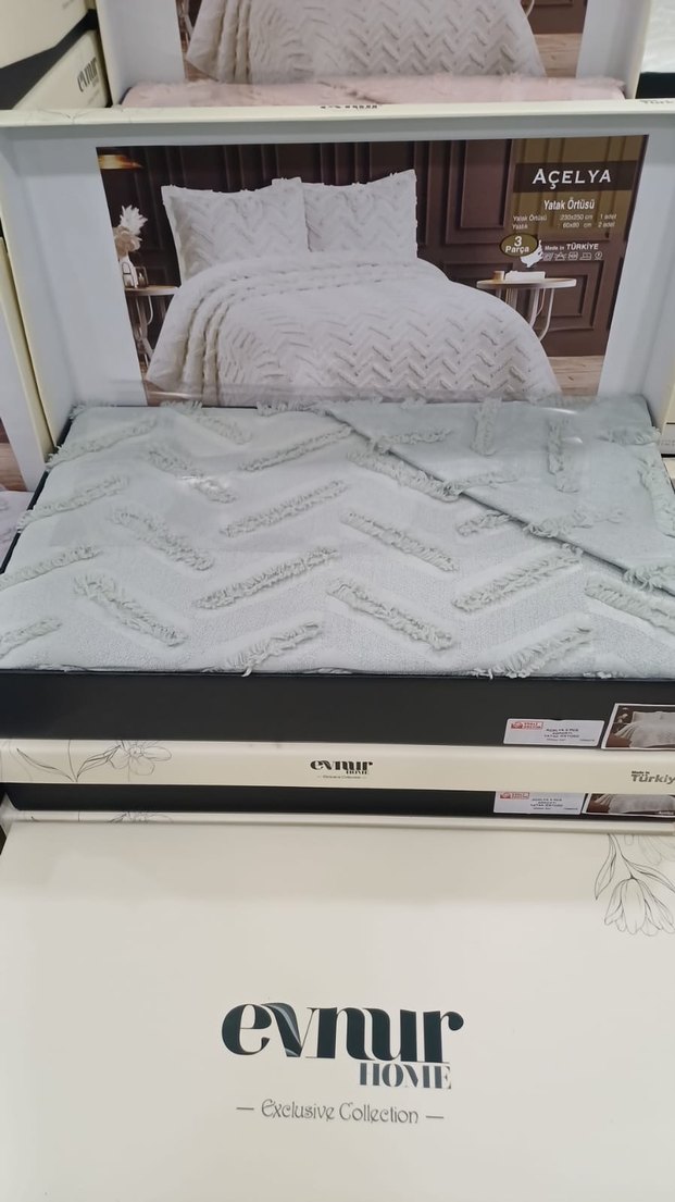 Gri renkli, desenli ve dokulu tasarıma sahip yatak örtüsü. Evnur markasına ait ACELYA modeli. ️