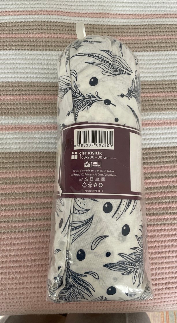 Beyaz zemin üzerine mavi baskılı bitkisel desenlere sahip çift kişilik nevresim takımı, yumuşak ve nefes alabilir kumaştan, ölçüleri 160x200+30 cm.