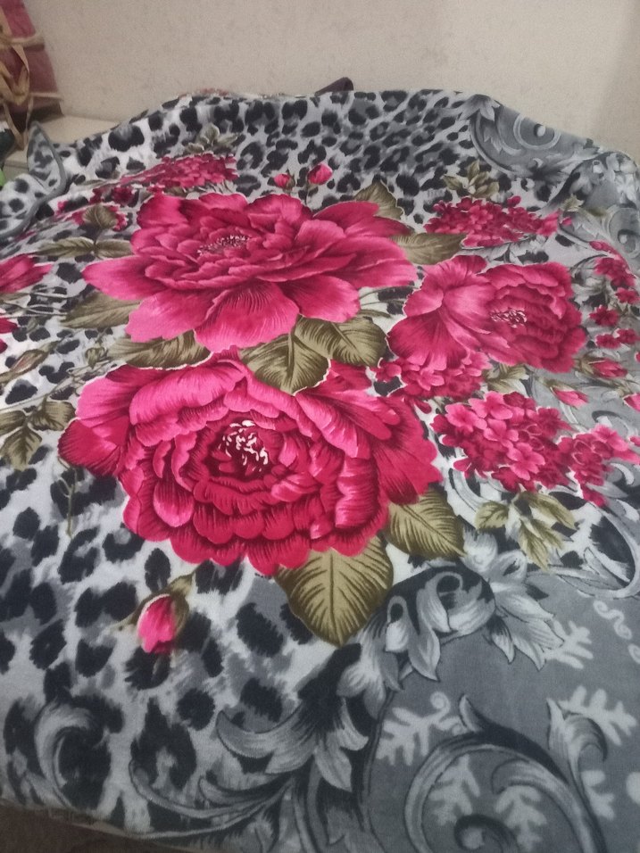 Gri zemin üzerine canlı pembe çiçek desenleriyle drapeli, yumuşak sentetik kumaştan yapılmış kadın şalı.