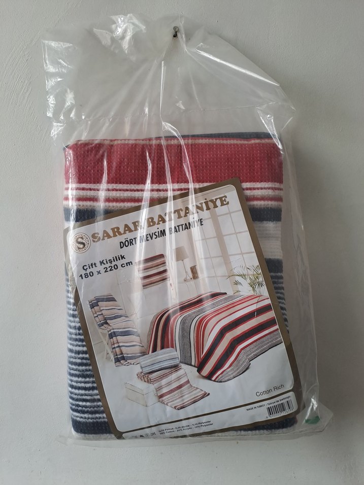 180x220 cm ölçülerinde, çok renkli baskılı, gri tonlu çift kişilik pamuklu dört mevsim battaniye. ️