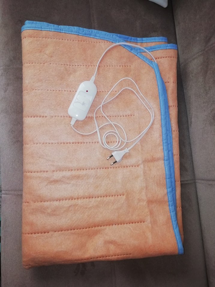 Mavi kenarlıklı, pembe ve somon renkli, çift kişilik elektrikli battaniye, ayarlanabilir 2 aşamalı ısı için kontrol anahtarı ile birlikte. Ölçüsü 120 ye 160 cm.