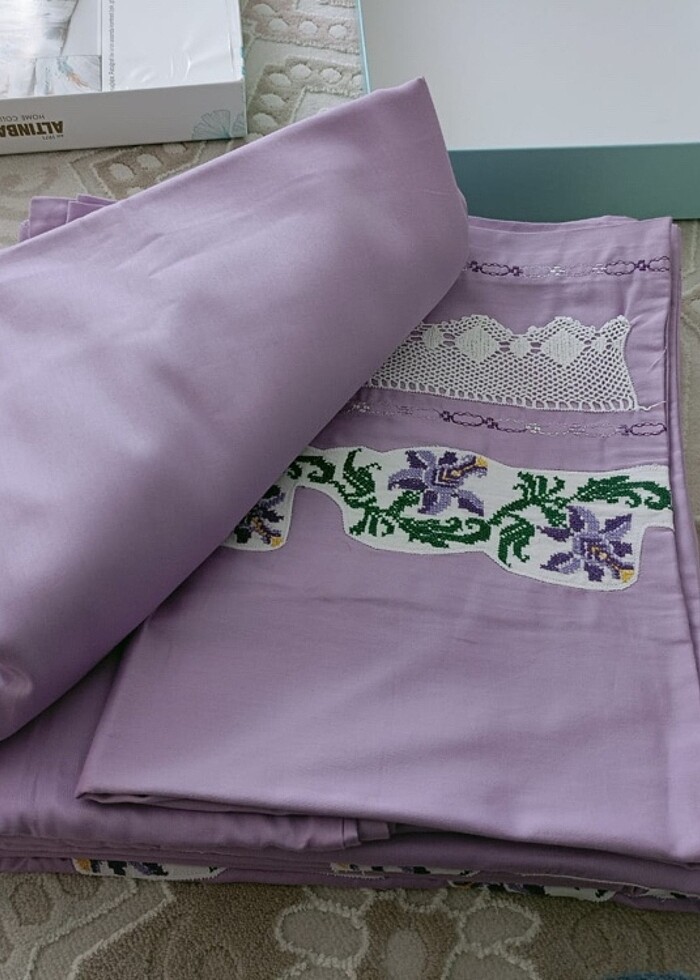 Çift kişilik lila pamuk saten nakışlı nevresim takımı