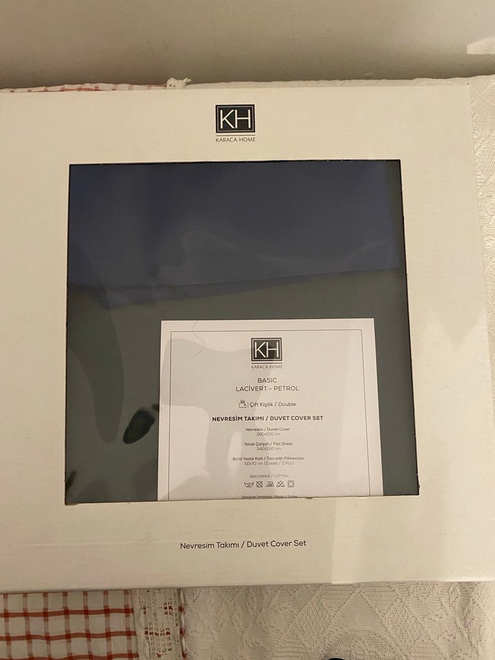 KH markalı, çift kişilik nevresim takımı, yumuşak kumaştan üretilmiştir.