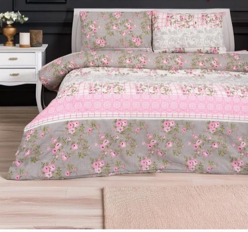 Çift Kişilik Pembe ve Gri Çiçek Desenli Nevresim Takımı