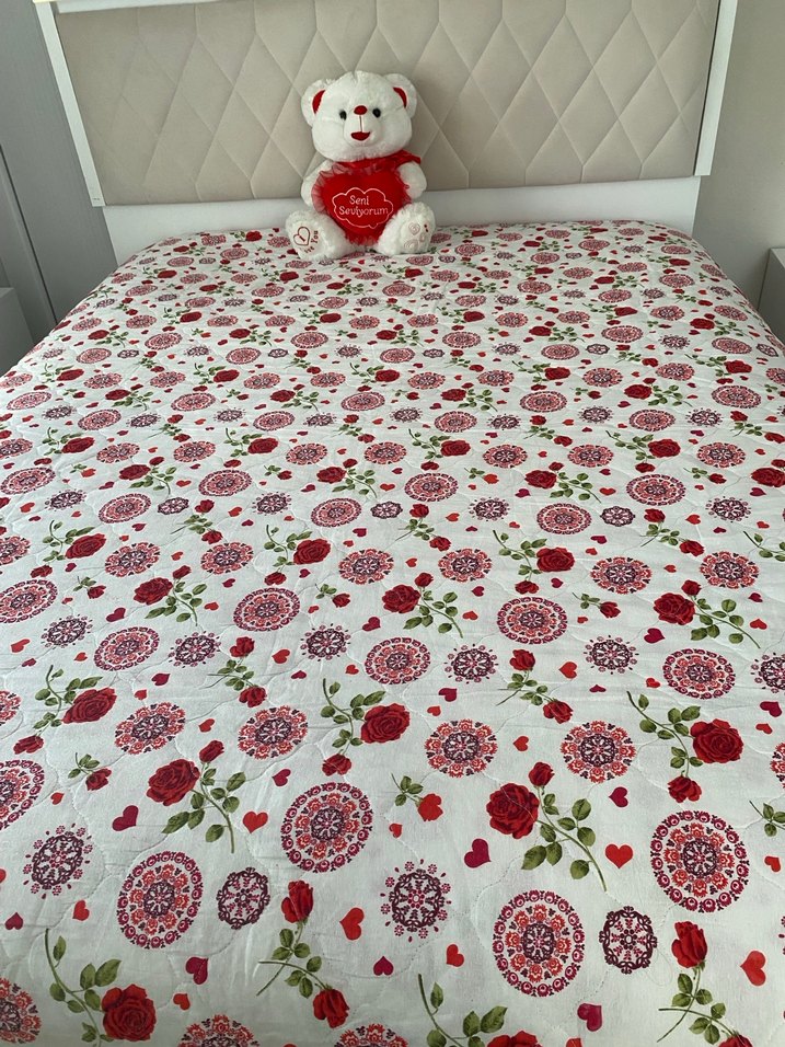 Beyaz zemin üzerinde kırmızı ve pembe tonlarında çiçek desenleri bulunan yumuşak dokulu nevresim örtüsü.