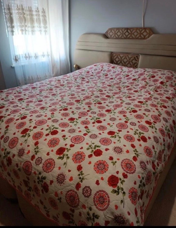 Yumuşak dokulu, açık kırmızı çiçek desenli yatak örtüsü, yatak odanıza sıcaklık katar.