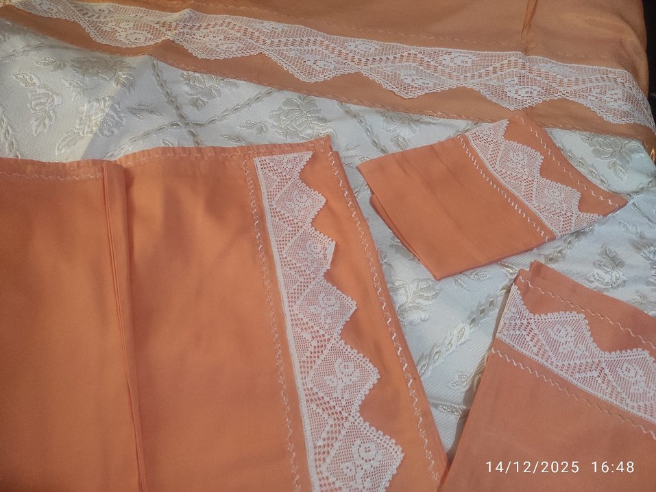 Pike ağzındaki dantelin genişliği 16 cm. pike en 246 cm, boy 240 cm, çarşaf 2 tarafı dantelli ,dantelin genişliği 9.5 cm, çift yastık ve dantelli. Hiç kullanılmadı ihtiyaç için satılık Pamuklu pike üst simli ,kumaşı pamuk saten tam çeyizlik