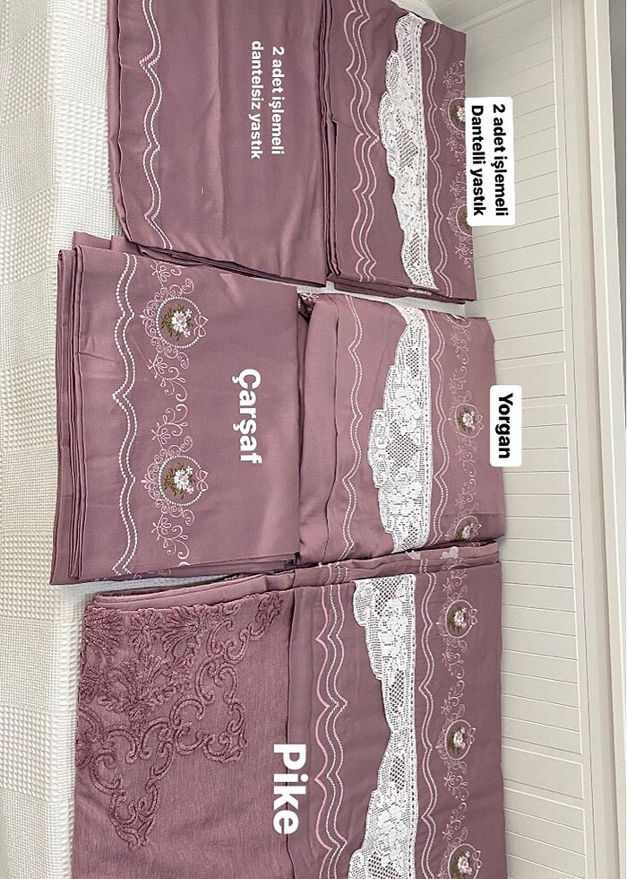Çift kişilik pike takımı hiç kullanılmadı çeyizim için yaptırdık ama ben dantel kullanmayı seven biri olmadığım için hiç kullanmadım fotoğraflarda detaylı bir şekilde çektim inceleyebilirsiniz Standart ölçülerde yapıldı Çift kişilik pike Çift kişilik yorgan Çift kişilik piko işlemeli çarşaf 2 adet piko işlemeli yastık 2 adet piko işlemeli dantelli yastık Dantelide ince iplikle yapıldı gayet güzel örülmüş yakından fotoğraf çektim bakabilirsiniz Pike takımını pikocuya sorduğumuzda 15.000 yapıldığını söylediler Buda hazır ve dantelinede ekstra ücret koymuyorum