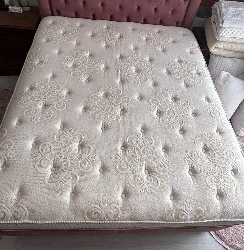 1.60x2.00 yükseklik 35cm çift kişilik yatak. yazlık ve kışlık olma üzere iki kısmı var hangi kısım kullanılacaksa onu çevirip kullanabilirsiniz hiçbir deformesi yok gayet kullanışlı ve yumuşak sadece son fotoğrafta belirtilen lekesi var ama o da ilk alındığında olan ve şu anda koku vs gibi bi sıkıntısı yok sadece görsel görünüyor. istanbul içi elden gelip teslim alabilirsiniz.