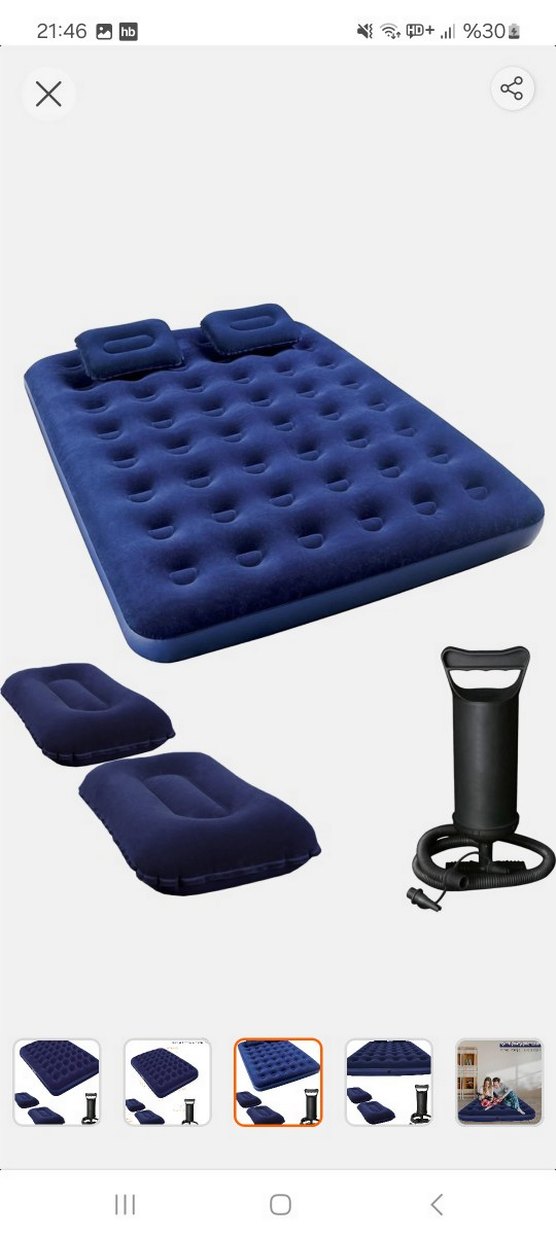 koyu lacivert şişme yatak seti, iki yastık ve kolay şişirme için el pompası içerir. Rahat ve taşınabilir. ️