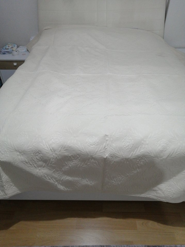 Beyaz yatak örtüsü, hafif kabartmalı çiçek desenine sahiptir ve yatak odanıza zarif bir görünüm kazandırır. Temizdir.