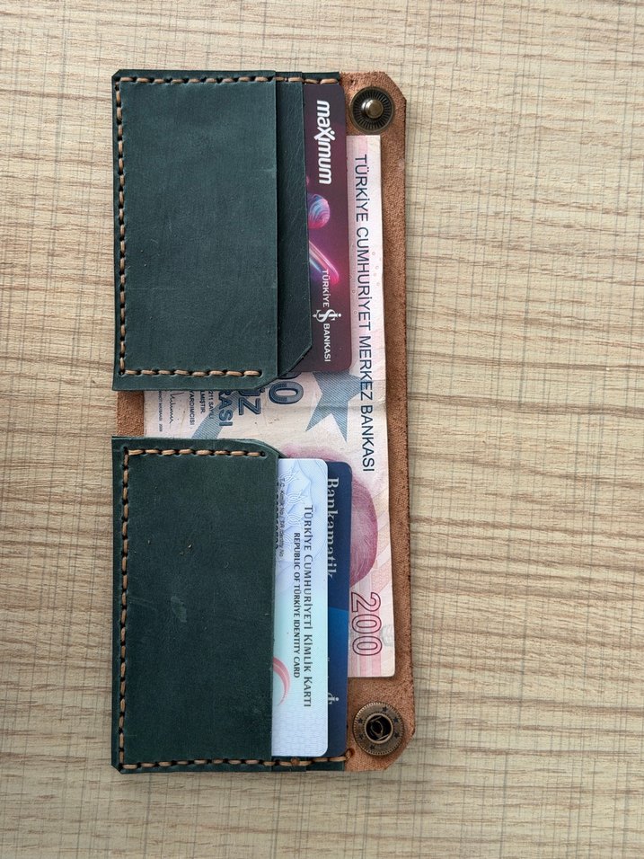 Ürün yeşil ve kahverengi hakiki deriler kullanılarak el dikişi ile üretilmiştir. Fazla para koyulduğunda sorun olmaması adına çıtçıt takılmıştır. Talebe göre farklı renk ve ebatlarda yapılabilir.