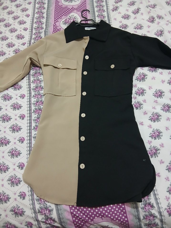 Kadınlar için çift renkli, düğmeli, uzun kollu gömlek. Normal midi boyda, notched lapel yakalı, iki cep detaylı, rahat kesim ve sentetik kumaştan üretilmiştir.