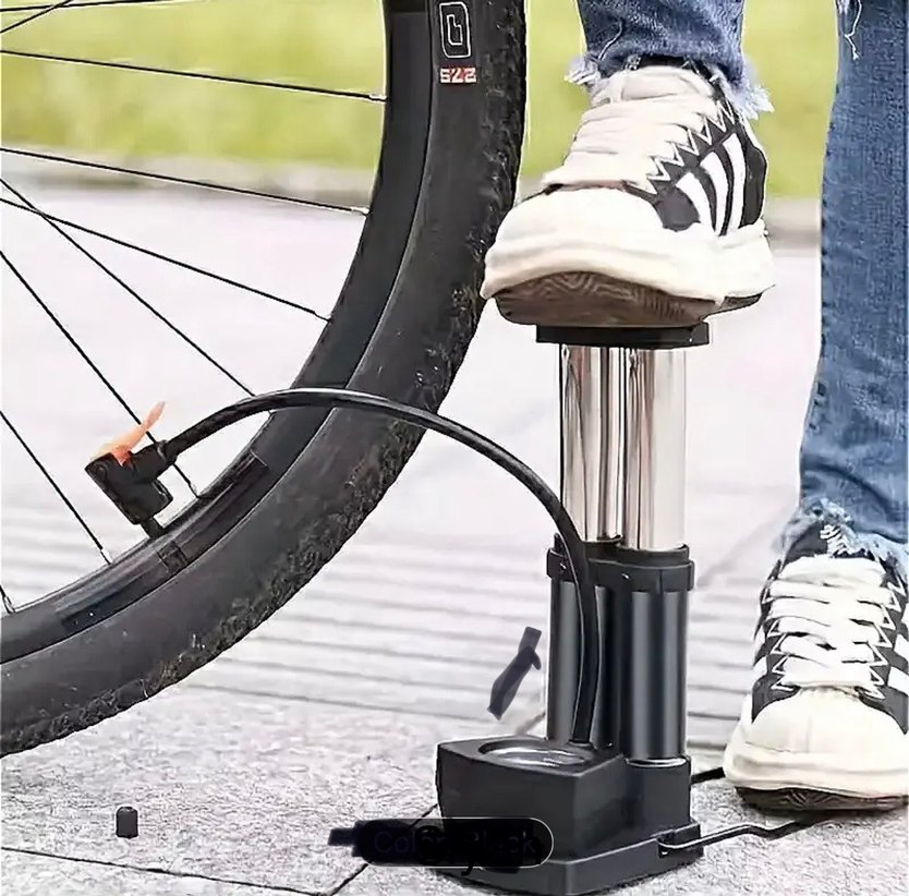 İki metal silindirli siyah ayak pompası, doğru ölçüm için basınç göstergesine sahiptir. Turuncu valfli hortum ve küçük aksesuarlar dahildir.