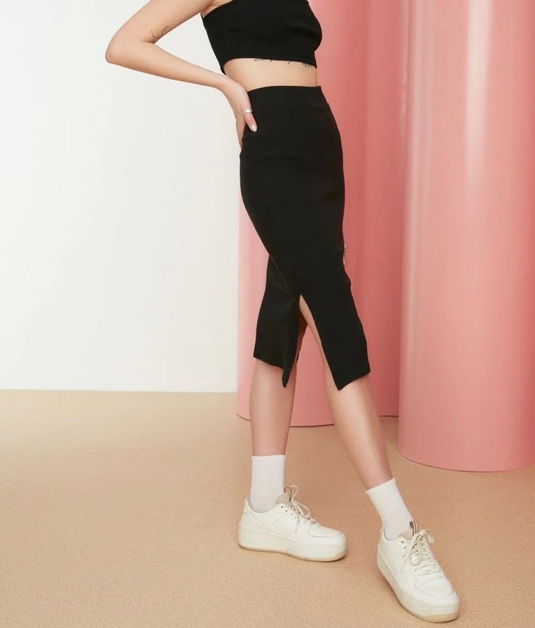 Yüksek bel, çift taraflı yırtmaç detaylı siyah fitilli midi etek, esnek dokusu ile rahat ve şık bir görünüm sağlar.