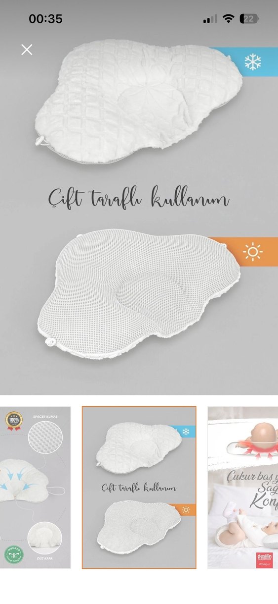Çift taraflı kullanıma sahip, beyaz ve gri renklerde yumuşak sentetik kumaştan yapılmış çocuk yastığıdır. Ergonomik şekillere sahiptir.