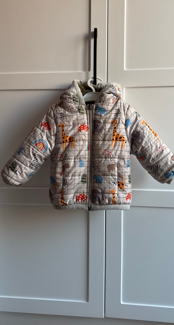 Ürün e- bebekten alınmıştır çift taraflı kullanılabilir.Gri renkte, kapüşonlu, fermuarlı ve baskılı desenli, bol kesim erkek çocuk montu. Yumuşak ve sıcak kumaştan üretilmiştir.