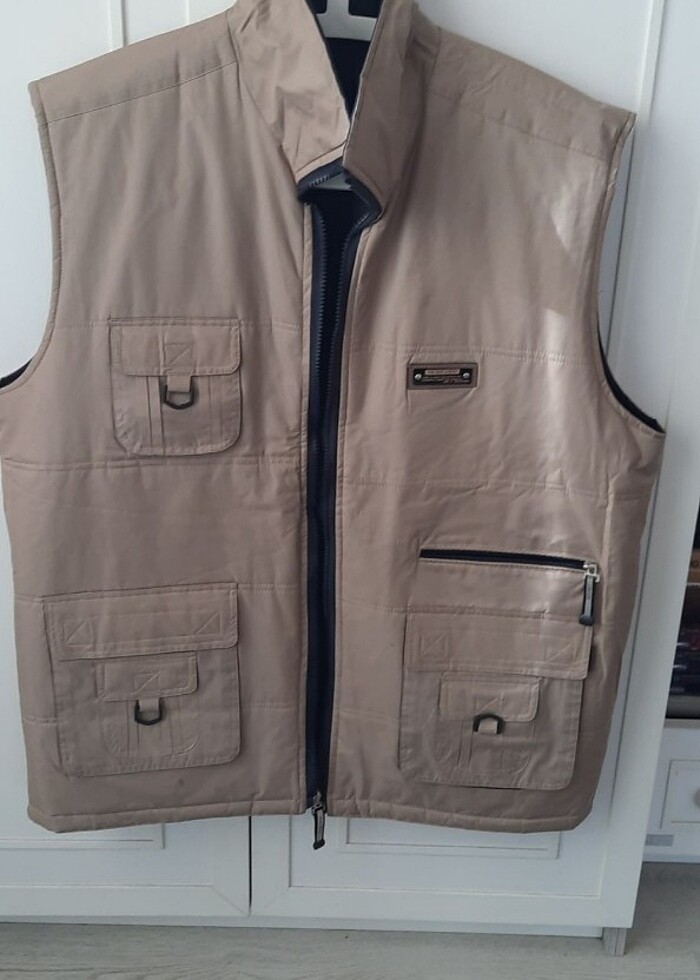 Çift taraflı yelek, bej ve siyah renk, etiketli değil fakat hiç kullanılmadı