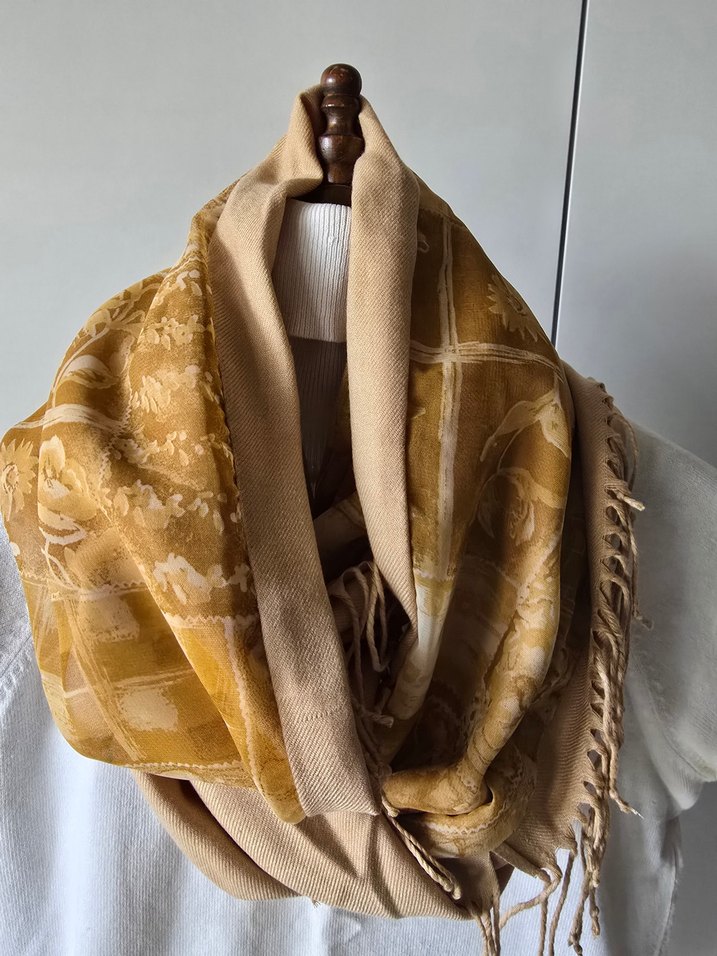 Bej renkte, dokuma kumaştan, püsküllü, bohem tarzda kadın şalı. Rahat ve şık bir kullanıma uygundur.