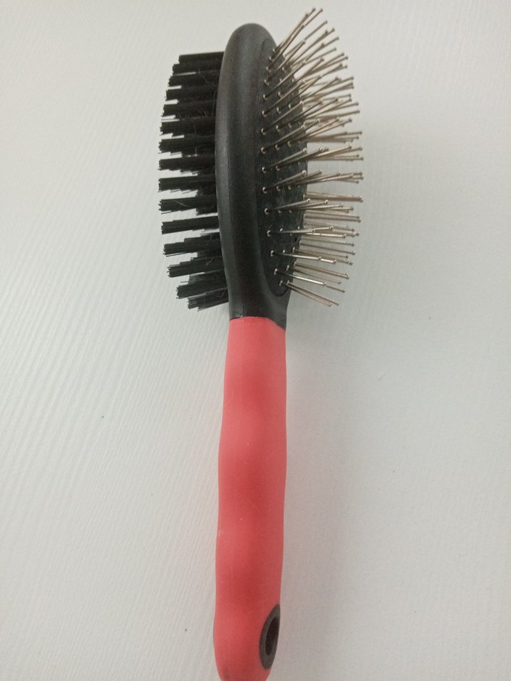 Kırmızı saplı, yumuşak kıllı ve metal uçlu çift taraflı köpek tüy fırçası.