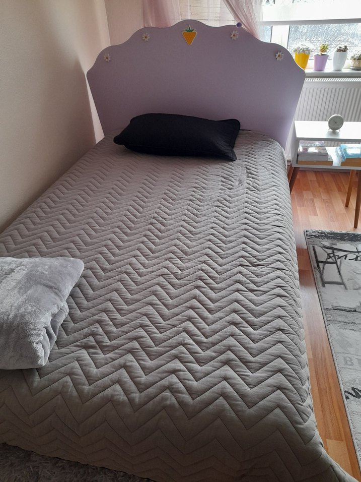 Gri renkte, düz ve hafif dokulu zikzak desenli yatak örtüsü, yatak için rahat ve pürüzsüz bir yüzey sunar. ️Birbuçuk kisilik yatakta örtülü fotoğrafta
