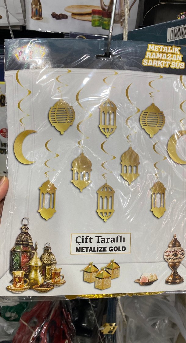Ramazan temalı, çift taraflı metalize altın renkte sarkıt süsler. Fener ve hilal figürleri içerir, parti süslemeleri için uygun.